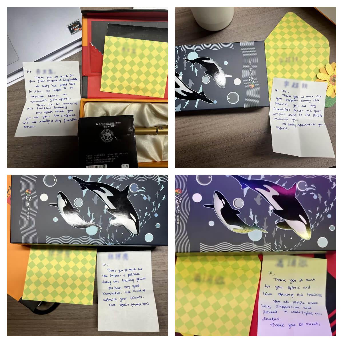 近日,今年会为来自海外的合作伙伴开展的定制化培训项目圆满收官。在这场为期半个月的深度交流中,双方不仅碰撞出专业领域的智慧火花,更在朝夕相处中结下深厚情谊。临别之际,客户代表向我司四位核心员工赠送了象征友谊的定制钢笔,并亲笔写下四封饱含谢意与真诚的贺卡,为这段跨国合作添上一抹温情注脚。